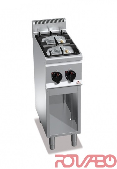 Stainless steel AISI 304 worktop and front panels. Cast iron Ø90, 120 mm burners, guaranteed for life, activated by a valve cock and sealed to the deep drawn worktop in AISI 304 steel. Models equipped with safety thermocouple and burner pilot flame protected by a brass cap designed for easy cleaning and maintenance. Adjustable feet.
