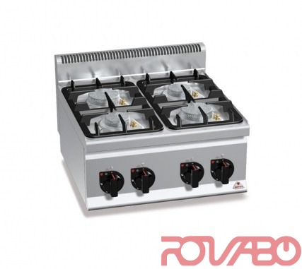 Stainless steel AISI 304 worktop and front panels. Cast iron burners, guaranteed for life, activated by a valve cock and sealed to the deep drawn worktop in AISI 304 steel. Models equipped with safety thermocouple and burner pilot flame protected by a brass cap designed for easy cleaning and maintenance.