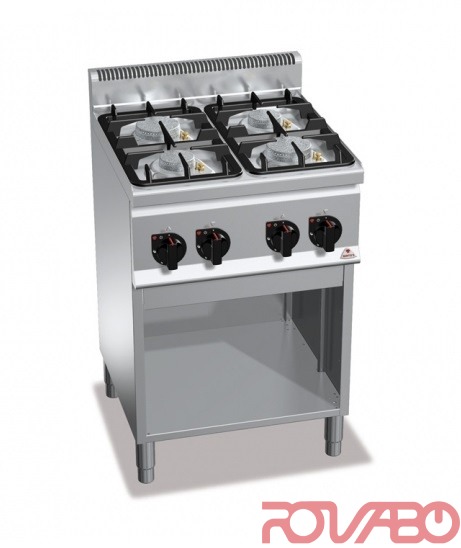 Stainless steel AISI 304 worktop and front panels. Cast iron burners, guaranteed for life, activated by a valve cock and sealed to the deep drawn worktop in AISI 304 steel. Models equipped with safety thermocouple and burner pilot flame protected by a brass cap designed for easy cleaning and maintenance. Adjustable feet.