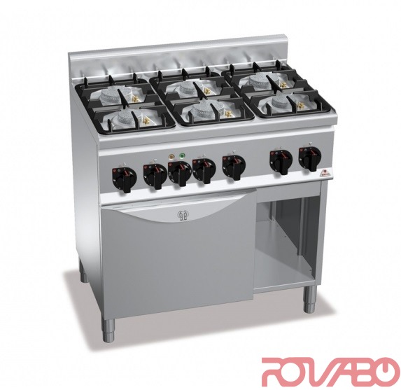 Worktop in AISI 304 stainless steel. Cast iron burners, guaranteed for life, activated by a valve cock and attached by waterproof seal to the deep drawn worktop in AISI 304 steel. Models equipped with safety thermocouple and burner pilot flame protected by a brass cap designed for easy cleaning and maintenance. Stainless steel electric convection oven with 3 levels of rack guides for 1/1 GN shelves/trays. Power indicator and temperature light. Stainless steel outer and inner door. 20/10stainless steel heat-resistant door handle. Adjustable feet.Standard: 1 anti-tilt oven shelf.