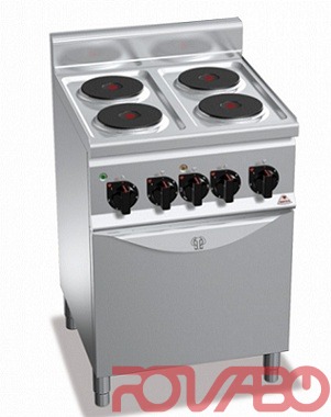 Stainless steel AISI 304 worktop and front panels.One piece pressed waterproof worktop. Cast iron plates with safety thermostat and 6-position selector that activates 6 different concentric power zones.Power lights.Stainless steel electric convection oven with 3 levels of rack guides for 1/1 GN shelves/trays. Power indicator and temperature light.Stainless steel outer and inner door. 20/10 stainless steel heat-resistant door handle. Adjustable feet.Standard: 1 anti-tilt oven shelf.