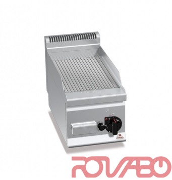 Worktop in AISI 304 stainless steel.Tubular burners with self-stabilized flame of a large surface area for a greater uniformity of heat distribution. Regulation of the supplied power by a continuous operation tap. Pilot flame and thermocouple safety valve. Piezo ignition button with silicone protection. Temperature over 300° C.Brushed steel RIBBED plate with splash guard. Slightly inclined cooking surface with a large size drain hole and a line to the drain pan.