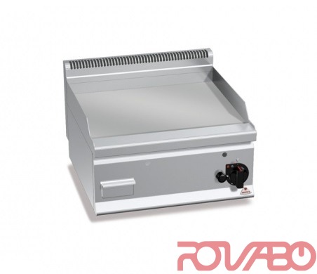 Worktop in AISI 304 stainless steel.Tubular burners with self-stabilized flame of a large surface area for a greater uniformity of heat distribution. Regulation of the supplied power by a continuous operation tap.Pilot flame and safety thermocouple valve. Piezoelectric ignition button with silicone protection.Temperature over 300°C.Brushed steel smooth plate with splash guard. Slightly inclined cooking surface with a largely sized drain hole and a line to the drain pan.