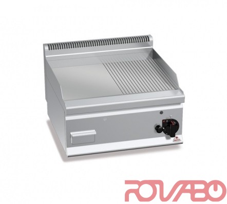 Stainless steel AISI 304 worktop and front panels.Tubular burners with self-stabilized flame of a large surface area for a greater uniformity of heat distribution. Regulation of the supplied power by a continuous operation tap. Pilot flame and thermocouple safety valve. Piezo ignition button with silicone protection. Temperature over 300°C.Half SMOOTH and half RIBBED plate of brushed steel with splash guard. Slightly inclined cooking surface with a large size drain hole and a line to the drain pan.