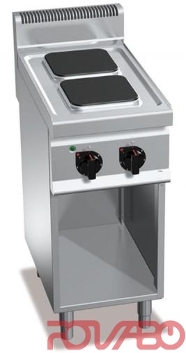 Worktop and front panels of AISI 304 stainless steel. Presøsed top in a unique watertight piece. Cast iron plates with safety thermostat and 6-position selector that activates 6 different concentric power zones. Voltage light and power light. Adjustable feet.