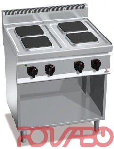 Worktop and front panels of AISI 304 stainless steel. Pressed top in a unique watertight piece. Cast iron plates with safety thermostat and 6-position selector that activates 6 different concentric power zones. Voltage light and power light. Adjustable feet.
