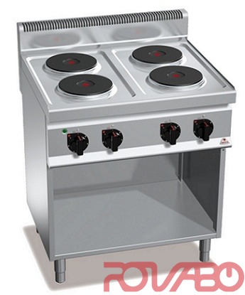 Worktop and front panels of AISI 304 stainless steel. Pressed top in a unique watertight piece. Cast iron plates with safety thermostat and 6-position selector that activates 6 different concentric power zones. Voltage light and power light. Adjustable feet.