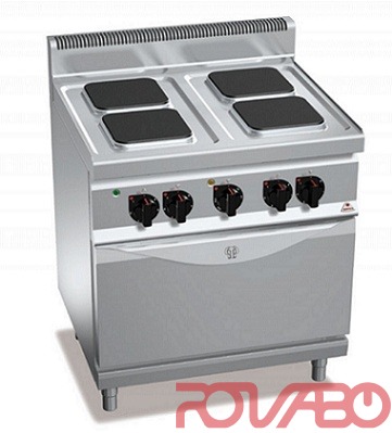 Worktop and front panels of AISI 304 stainless steel. Pressed top in a unique watertight piece. Cast iron plates with safety thermostat and 6-position selector that activates 6 different concentric power zones. Voltage light and power light. Electric static oven completely made of STAINLESS STEEL with 4 levels for grids/pans. Grill with salamander function on the upper side and a thermostat for the correct regulation of temperature from 50° a 270° C. Pilot light and temperature indicator light. Pressed door and counter door made of AISI 304 steel. High resistance door handle of AISI 304 steel of 20/10 thickness. Adjustable feet. Standard: no. 1 anti-tilting oven grid.