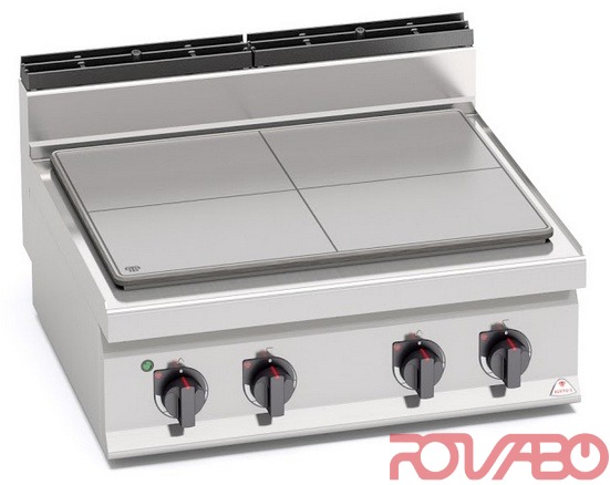 Worktop and front panels made of AISI 304 stainless steel. Special extra thick steel surface with 4 independent cooking zones. Heating by filament resistances installed under the plate and enabled by power regulators. Power light.