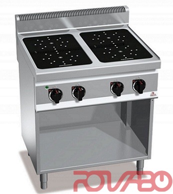 Worktop and front panels made of AISI 304 stainless steel. Pyroceram top with 6 mm thickness. Electrical resistances able to reach a high temperature (500° C) heating the cooking top by irradiation. The zones are marked by proper serigraphy that allow the proper positioning of the pans. After switching off each zone, a light signals residual heat up to 60° C to safe-guard the operator. High resistance handle of AISI 304 steel with 20/10 thickness. Adjustable feet.