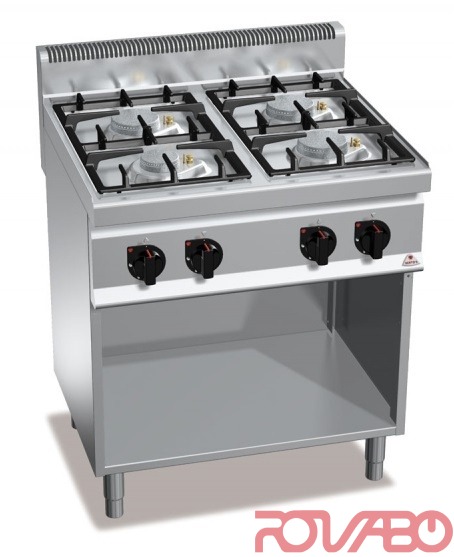 AISI 304 stainless steel worktop and front panels. Lifetime guaranteed cast iron burners; activated by a valve tap and watertight, fi xed to the AISI steel board by deep pressings. Safety thermocouple on both models. G7F4BPW and G7F4MPW models equipped with burner pilot fl ame protected by a brass covering for an easy cleaning and maintenance. Adjustable feet.
