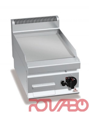 Worktop and front panels from AISI 304 stainless steel. 5.932 kcal/h. Tubular burners with self-stabilized flame on a large surface for a greater uniformity in heat distribution. Regulation of the supplied power by a continuous operation tap. Pilot flame and thermocouple safety valve. Piezoelectric ignition with silicone protection. Maximum temperature beyond 300° C. Smooth satin finish steel plate occupying the entire worktop surface with flush splashguard. Slightly inclined cooking surface with a large hole to allow drainage of liquid into an appropriate waste container.
