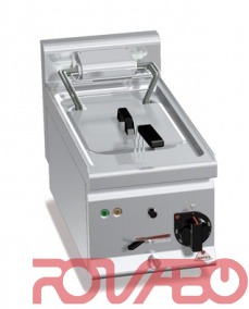 Front panels made of AISI 304 STAINLESS STEEL. Pressed and rounded tank equipped with long lasting special rotating resistances made of Incoloy stainless steel; they can reach the operational temperature in very short time increasing oil savings to 60%. The frying system maintains the organoleptic characteristics of the oil which allows for a healthier production and furthermore, limits the required oil changes giving further savings. The resistance rotation makes cleaning operations easier. Adjustable thermostat up to 190° C with control facility, safety thermostat and manual restart. Average frying time of 4 minutes. Pre-heating time of 4-5 minutes (from 20 to 190°C). Maximum output 25 kg/h.