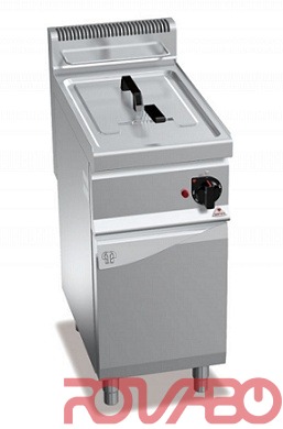 Front panels made of AISI 304 stainless steel. Pressed tank with a wide cold zone to collect food residue. Easy to clean, thanks to the absence of tubes and the large section of 1” drain pipe. Two stainless steel burners installed out of the tank, controlled by a solenoid valve with a temperature control by means of a high precision electric thermostat. The frying system maintains the oil’s organoleptic characteristics, which allows for cooking in a healthier way and, furthermore, limits the required oil changes, giving further savings. Pilot flame and safety system with thermocouple and thermostat. Temperature adjustment from 110° to 190°C. Maximum output per hour: 20 kg. Average frying time of 6 minutes. Pre-heating time of 10 minutes (from 20 to 190°C). Electric ignition. Adjustable feet. Accessories: tray protection screen.