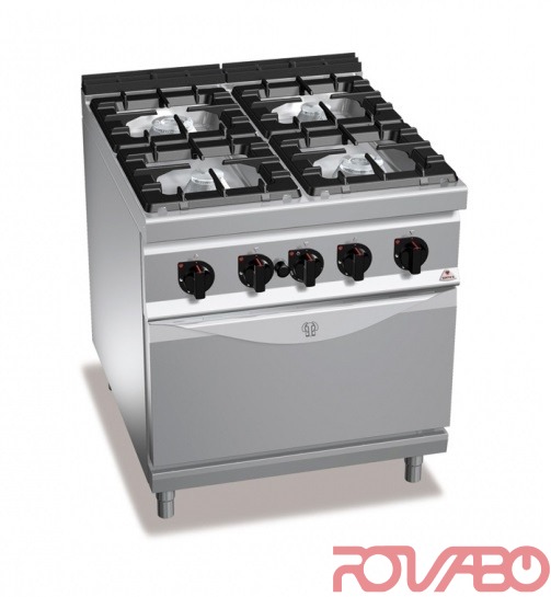 Worktop, front and side panels made of AISI 304 stainless steel. Inside AISI 430. Cast iron burners with thermocouple safety valve and protected pilot flame with regulation up to 3.5 kW on the 80 mm version, regulation up to 7 kW on the 108 mm version and regulation up to 12 kW on the 130 mm version. 36.371 kcal/h. Gas oven with self-stabilized flame burner positioned under the enamelled steel base and adjustable thermostat from 160° to 280°. Oven chamber from AISI 430 with 4-level supports and internal,pressed and ribbed door from stainless steel. Internal chimney from stainless steel and burners support from AISI 430 stainless steel. High resistance and double-pressed handles from AISI 304 stainless steel of 20/10 thickness. Pressed trays from AISI 304 stainless steel.