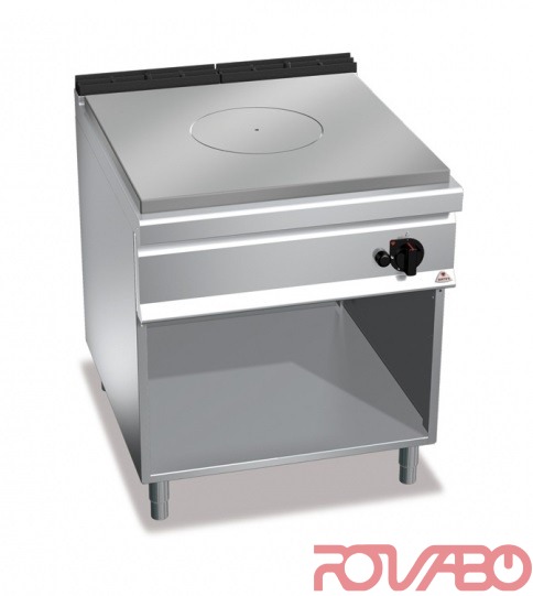Worktop, front and side panels made of AISI 304 stainless steel. Inside AISI 430. 11.177 kcal/h. Central cast iron burner with optimized combustion, 13 kW maximum power with thermocouplesafety valve and pilot flame. Piezoelectric ignition and coating of the combustionchamber from vermiculite, a high performance insulating material.Steel plate of high thickness and differentiated thermal areas: maximum temperature at the centre,decreasing to the edges.