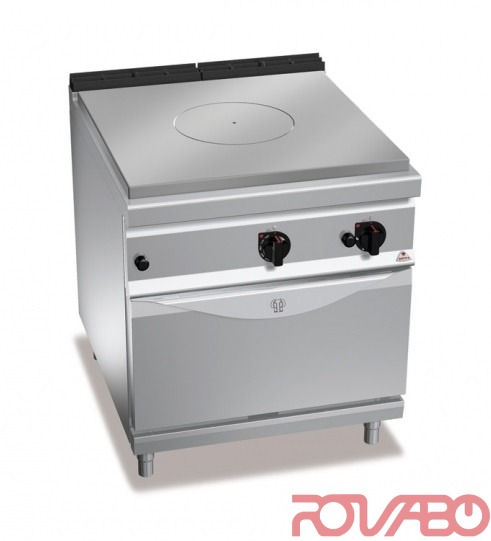Worktop, front and side panels made of AISI 304 stainless steel. Inside made of stainless steel. 17.884 kcal/h. Central cast iron burner with optimized combustion, 13 kW maximum power with thermocouple safety valve and pilot flame. Piezoelectric ignition and coating of the combustion chamber from vermiculite, a high performance insulating material. Steel plate of high thickness and differentiated thermal areas: maximum temperature at the centre, decreasing to the edges. Gas oven with self-stabilized flame burner positioned under the enamelled steel base and adjustable thermostat from 160° to 280°. Oven chamber from AISI 430 with 4-level supports and internal, pressed and ribbed door from stainless steel. Internal chimney from stainless steel and burners support from AISI 430 stainless steel. High resistance handle from AISI 304 stainless steel of 20/10 thickness.