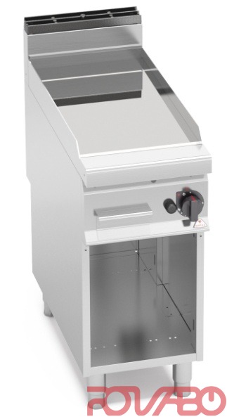Worktop and front panels made of AISI 304 stainless steel. 8,598 kcal/h. Tubular flame burners with of a large surface for a greater uniformity of heat distribution. Valve with 60-300°C thermostatic control for a precise and safe regulation. Pilot flame and thermocouple safety valve. Piezoelectric ignition button with rubber protection. Very thick smooth plate with flush splashguard. Two-component cooking plate, which combines a steel plate to optimize uniformity with an upper coating in AISI 316 polished stainless steel for easy cleaning and low level of radiation, for greater operator comfort. Particularly suitable for delicate cooking. Slightly inclined cooking surface with large drain hole and pipe in a special container. Optional: oval teflon stopper, door with handle of 20/10 thickness.