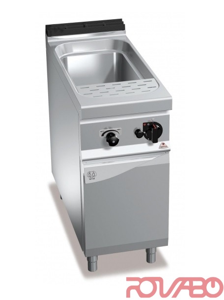 Worktop, front and side panels made of AISI 304 stainless steel. Inside made of stainless steel. 10.318 kcal/h. High performances guaranteed by the heating system that externally wraps around the entire tank surface. Pilot flame and thermocouple safety valve. Piezoelectric ignition with rubber protection. Pressed tank with large rounded edges completely made in AISI 316 stainless steel. Water circulation guaranteed by a drilled bottom that keeps the baskets 10 cm from the bottom. Large diameter overflow to eliminate the excess starch during cooking. Draining and disassembleable board at the same height of the top. The tap on the board allows one to regulate the water flow through a control on the front panel.Spherical draining tap positioned in the compartment controlled by an athermic handle.