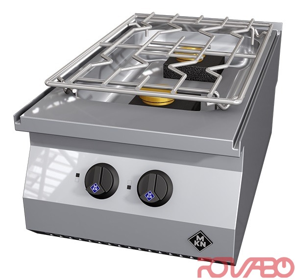 Economical and highly efficient connected loads. Hob depth of 70 mm prevents the burning on of boiled over food. 1 C-burner 3,5 kW (at the front), 1 D-burner 5,6 kW (at the rear). DN 15 (½") gas connection required. Atmospheric burner, ignition burner, thermoelectric safeguard, gas tap. Natural 20; 25 mbar or liquid gas 30; 37; 50 mbar. Accessories: 1 chrome nickel steel sliding grid (370x550 mm). Optional accessories: 1 simmering plate for 1 burner, 1 chrome nickel steel grid to cover 1 burner (274x370 mm).