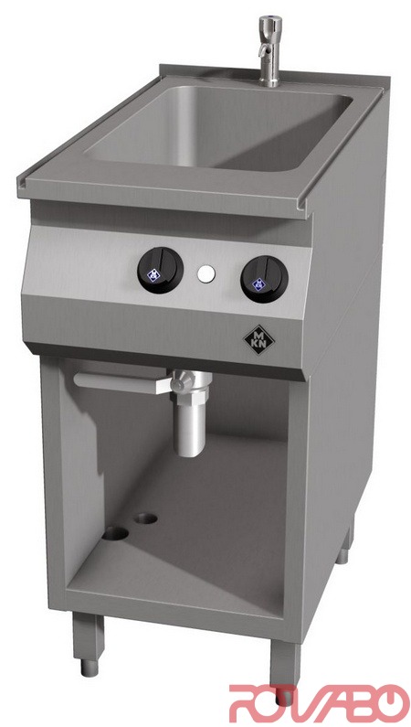 Basin 305x510, 210 mm deep. A multifunctional appliance for cooking and keeping warm. Welded-in basin made completely of corrosion-resistant chrome nickel steel (1.4404) (AISI 316). SUPRA heating system ensures short heating up times and a longer service life of the heating elements. Variable power adjustment and thermostatic temperature regulation. Very easy to clean because of indirect heating. Power adjustment switch, thermostat, control lamp, safety temperature thermostat, SUPRA contact heating elements, relay, mains connection, IPX4. Drain ball valve R 1½", swivelling water inlet tap. Equipped as standard with interface for connection to an energy optimization system according to DIN 18875 and potential free contact. Accessories: 1 water inlet tap R½" behind the basin. Optional accessories: 1 overflow plug, 1 shelf insert, appliance foot, 200 mm high, pluggable +/– 15 mm height adjustable (4 feet).