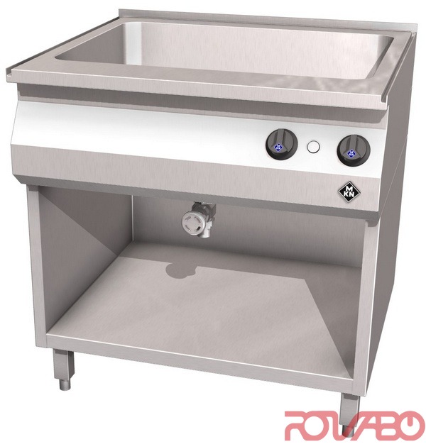 Moulded steel basin with large corner radii – seamlessly and tightly welded into the top plate. Basin 630x510х215 mm deep, drain at the bottom. Main switch, thermostat, control lamp, tubular heating elements, mains connection, IPX 4. Thermostatic temperature regulation – indirect heating ensures easy cleaning. Optionally equipped with interface for connection to an energy optimization system according to DIN 18875, with potential free contact. Optional accessories: 1 rotatable water inlet tap R½", 1 shelf insert (2 are required), appliance foot, 200 mm high, pluggable +/– 15 mm height adjustable (4 feet).