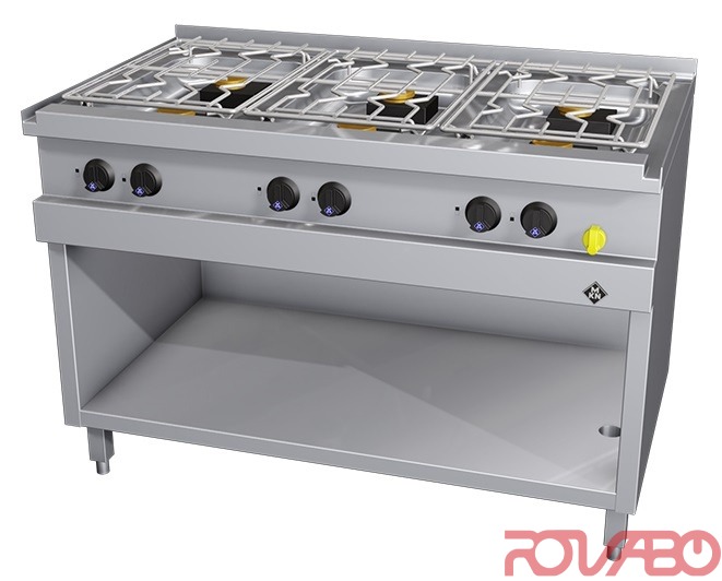 Moulded steel hobs tightly fitted to the substructure. Hob depth of 70 mm prevents the burning on of boiled over food. Gas tap in the front panel as standard. DVGW tested. 4xC-burner 3.5 kW each, 2xD-burner 5.6 kW each (front left, front middle). DN 20 (¾") gas connection required. Atmospheric burner, ignition burner, thermoelectric safeguard, tap switch, manual ignition, gas stop tap. Natural 20; 25 mbar or liquid gas 30; 37; 50 mbar. 3 CNS sliding grid (370 x 550 mm each).