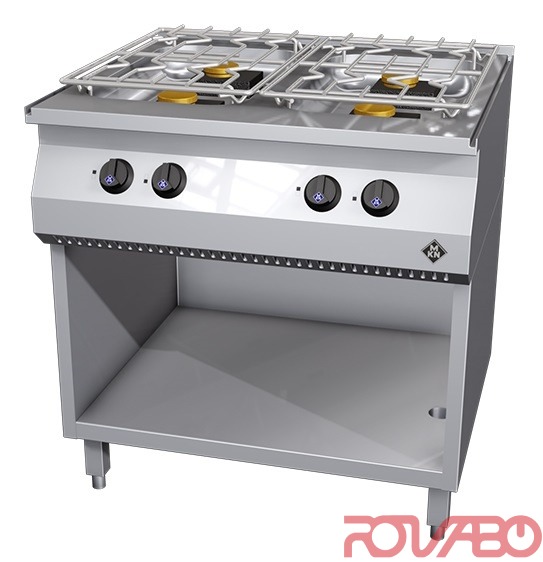 Moulded steel hobs tightly fitted to the substructure. Hob depth of 70 mm prevents the burning on of boiled over food. DN 15 (½") gas connection required. 2 x C-burner 3.5 kW each (front right, rear left), 2 x D-burner 5.6 kW each (front left, rear right). Atmospheric burner, ignition burner, thermoelectric safeguard, tap switch, manual ignition and temperature control. Accessories: 2 chrome nickel steel sliding grid (370x550 mm). Optional accessories: 1 simmering plate for 1 burner, 1 chrome nickel steel grid to cover 1 burner (274x370 mm).