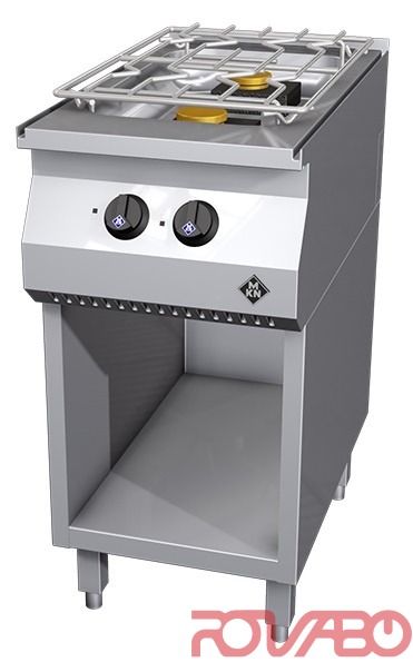 Moulded steel hobs tightly fitted to the substructure. Hob depth of 70 mm prevents the burning on of boiled over food. DN 15 (½") gas connection required. 1 x C-burner 3.5 kW (at the rear), 1 x D-burner 5.6 kW (at the front). Atmospheric burner, ignition burner, thermoelectric safeguard, manual ignition and temperature control. Accessories: 1 chrome nickel steel sliding grid (370x550 mm). Optional accessories: 1 simmering plate for 1 burner, 1 chrome nickel steel grid to cover 1 burner (274x370 mm).