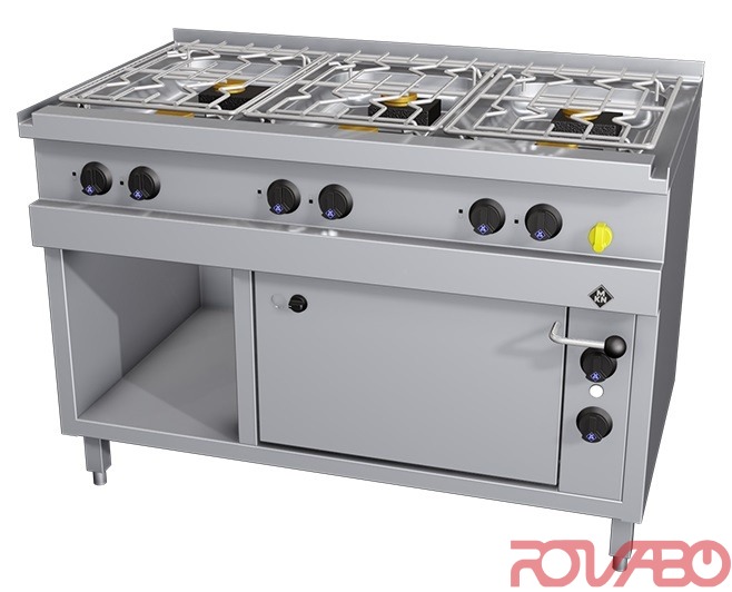 Moulded steel hobs tightly fitted to the substructure. Hob depth of 70 mm prevents the burning on of boiled over food. Gas tap in the front panel as standard. DVGW tested. 4xC-burner 3.5 kW each, 2xD-burner 5.6 kW each (front left, front middle). DN 20 (¾") gas connection required. Atmospheric burner, ignition burner, thermoelectric safeguard, tap switch, manual ignition, gas stop tap. Natural 20; 25 mbar or liquid gas 30; 37; 50 mbar. Electric oven 535x520x250 mm. Direct upper heat, indirect lower heat, 50-300°C. Internal tubular heating element for upper heat. Indirect lower heat controllable by a thermostat, with control lamp, control switch and safety temperature thermostat, mains connection, IPX 4. Accessories: 1 Special roasting and baking tray 1½ GN, granite enamelled, 40 mm deep, 1 CNS oven grid 1½ GN; 3 CNS sliding grid (370x550 mm each).