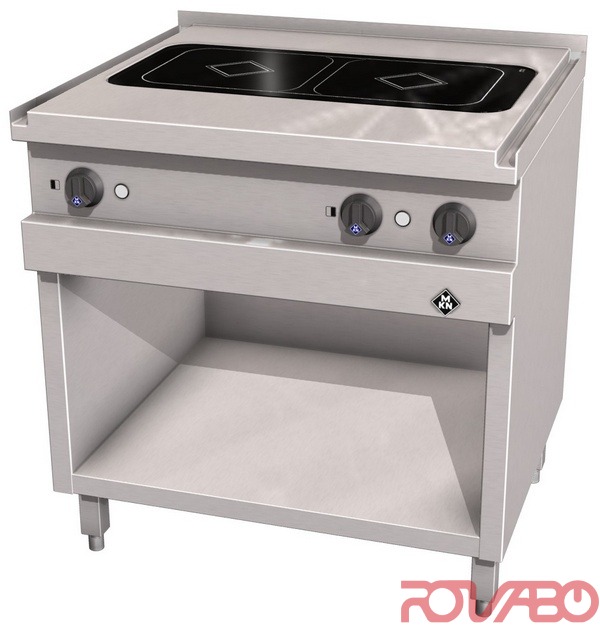 Seamless and solid ceramic hob 690x340 mm, easy to clean, 6 mm thick. Hob with 2 heating zones, 5.0 kW each. Electronic pan size recognition from 12 cm pan bottom diameter. Fast heat transfer, high efficiency. Infinitely variable heating power for each heating zone using a position switch – one control lamp for each heating zone individually aligned for keeping food warm, simmering, frying and heating up fast. Main switch, surface induction generator module 280x290 mm with control element, contactor, fan, mains connection, IPX 5. Heat emission sensitive: 0.7 kW, latent: 0.8 kW. Optional accessories: Appliance foot, 200 mm high, pluggable +/– 15 mm height adjustable (4 feet). Optionally equipped with interface for connection to an energy optimization system according to DIN 18875 with potential free contact.