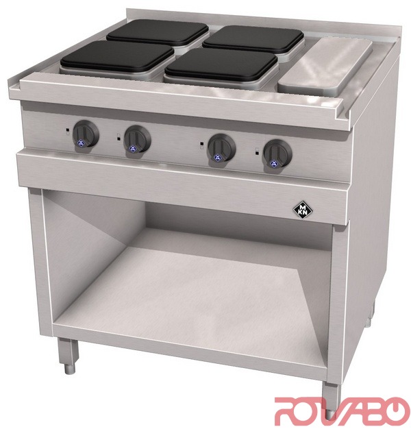 4 hot plates with protector 220х220 mm, 2,6 kW each. Protectors automatically cut down power level by approx. 50 % when not in use. 7 position switch for accurate temperature regulation. IPX 5. Efficient heat insulation. Space between hot plates less than 35 mm making moving of heavy cookware much easier. Oven, interior chamber and oven door made of chrome nickel steel. Optionally equipped for connection to a power optimization system with potential free contact.