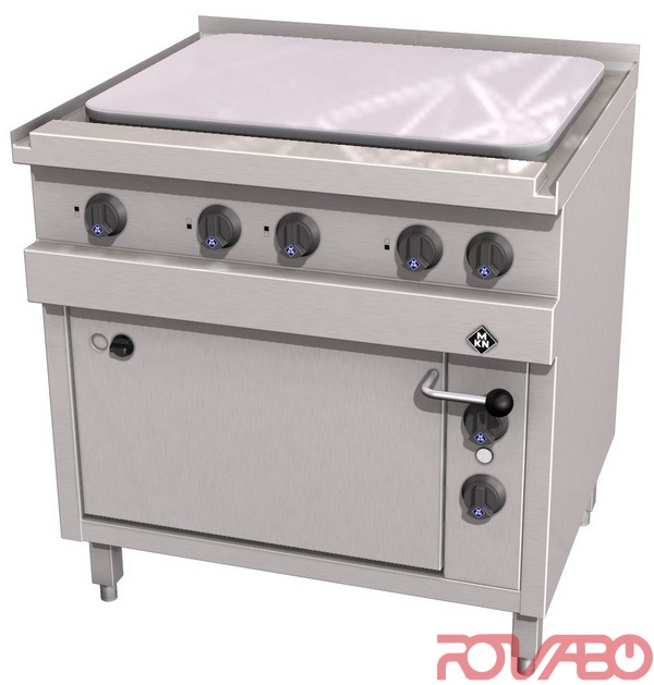 Seamless 715x555 mm hob 18 mm thick made of heat resistant steel. 4 zones of heating 3 kW each, electric oven 4.55 kW. Easy to clean hob due to corner radii. Tightly integrated into the top plate of the range. Separate thermostatically regulated heating zones – for cooking, simmering and keeping warm. Highly efficient contact heating elements. Even heavy cookware can be pushed easily over the whole surface. Different shapes and sizes of pots and pans are no longer a problem. Optionally equipped for connection to a power optimization system with potential free contact. Oven: 535x520x250 mm. Direct upper heat, indirect lower heat, 50-300°C. Internal tubular heating element for upper heat. Indirect lower heat controllable by a thermostat, with control lamp, control switch and safety temperature thermostat. 1 Special roasting and baking tray 1½ GN, granite enamelled, 40 mm deep, 1 CNS oven grid 1½ GN.