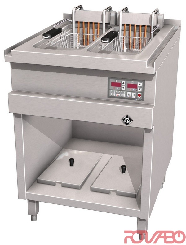 With EcoControl electronic temperature regulation and membrane keypad. Pressed steel frying basin 180x400x235 mm deep each is seamlessly welded into the top plate with large froth over tray. Chrome nickel steel tubular heating elements with a low surface load for longer lasting fat, basin with deeper, cool zone. Heating elements can be raised completely out of the frying basin, with holding bracket and automatic cut off, incl. for easy cleaning. Thermostatic or electronic temperature regulation. Safety temperature thermostat for reliable overheating protection. Main switch, thermostat, safety temperature thermostat, control lamp, tubular heating elements, contactor, end switch, mains connection, IPX 5. With basket lift. Equipped as standard with interface for connection to an energy optimization system according to DIN 18875 and potential free contact. Accessories: 2 Lids, 2 oil clarifying trays, 2 baskets "L". Optional accessories: oil receptacle 30 litres, oil filtering system, filter basket including 40 filter bags made of special fleece paper, appliance foot, 200 mm high, pluggable +/– 15 mm height adjustable (4 feet).