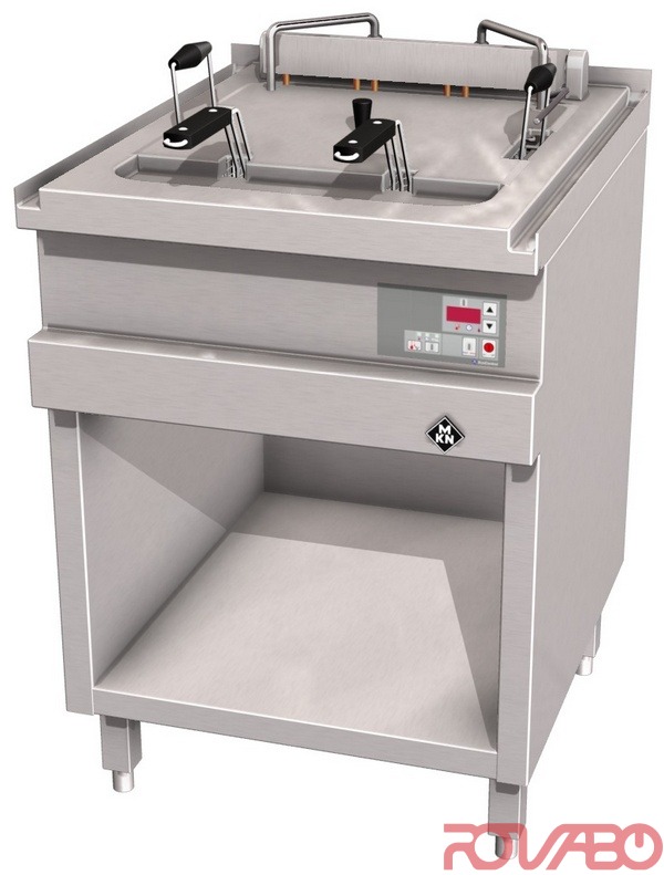 With EcoControl electronic temperature regulation and membrane keypad. Pressed steel frying basin 400x400x235 mm is seamlessly welded into the top plate with large froth over tray. Chrome nickel steel tubular heating elements with a low surface load for longer lasting fat, basin with deeper, cool zone. Heating elements can be raised completely out of the frying basin, with holding bracket and automatic cut off, incl. for easy cleaning. Thermostatic or electronic temperature regulation. Safety temperature thermostat for reliable overheating protection. Main switch, thermostat, safety temperature thermostat, control lamp, tubular heating elements, contactor, end switch, mains connection, IPX 5. With basket lift, no oil filtering system possible. Equipped as standard with interface for connection to an energy optimization system according to DIN 18875 and potential free contact. Accessories: 1 Lid, 1 oil clarifying tray, 1 basket "P", 2 baskets "L". Optional accessories: oil receptacle 30 litres, oil filtering system, filter basket including 40 filter bags made of special fleece paper, appliance foot, 200 mm high, pluggable +/– 15 mm height adjustable (4 feet).