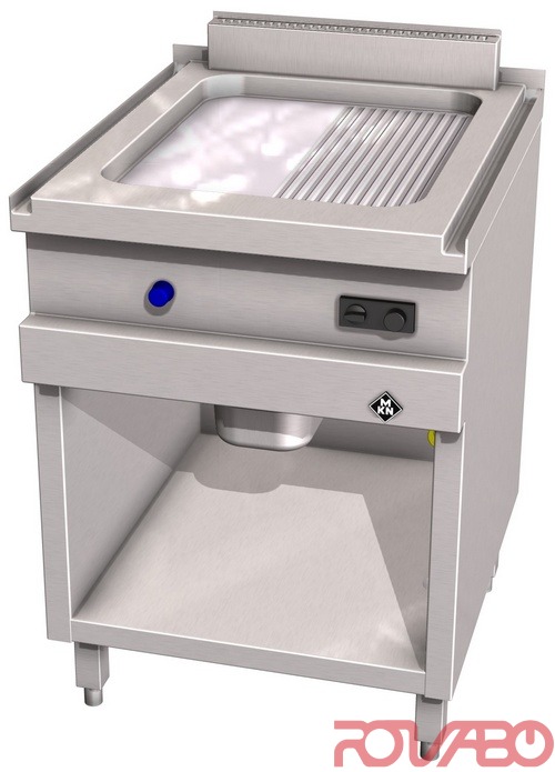 Half ribbed plate lowered and seamlessly welded into the top plate, with easy to clean corner radii. Thermostatic temperature regulation. Frying plate made of heat resistant special steel. Fat collecting container approx. 4 litres. Frying surface 420x545 mm. DN 15 (½") gas connection required. Natural 20; 25 mbar or liquid gas 30; 37; 50 mbar. Atmospheric burner, ignition burner, thermoelectric safeguard, thermostat, piezoelectric ignition.