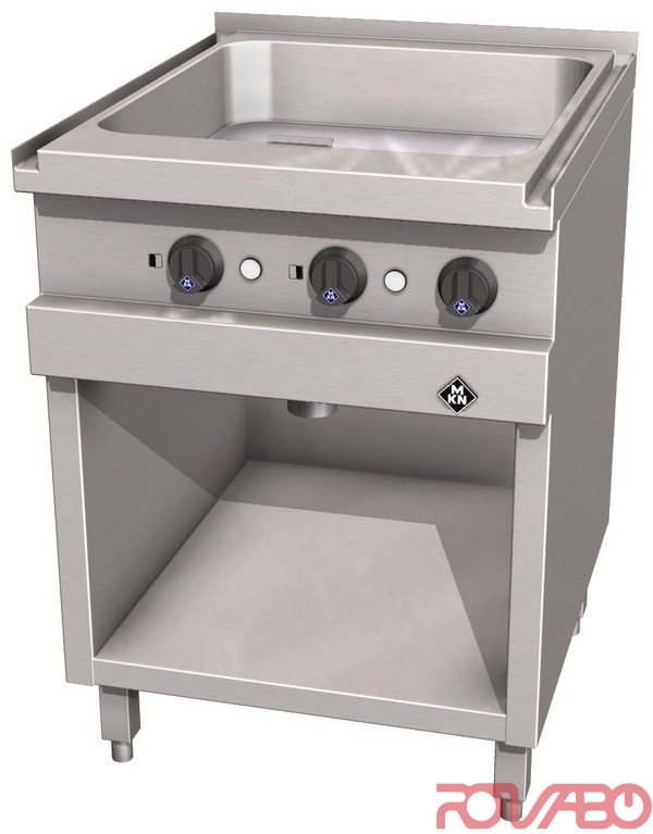 Multifunctional unit for frying, cooking and stewing. Appliance with two separate heating zones with thermostatic temperature regulation. Griddle pan with frying pan made completely of chrome nickel steel 1.4404 (AISI 316), frying surface 500x540, 100 mm deep made from a smoothly polished special sandwich material (MKN PowerBlock). Supra contact heating elements for optimal heat distribution and short heating up times. Greater heating capacity ensures even heat distribution and minimal temperature fluctuation when loading with cold food. Frying surface is tightly welded ensuring maximum hygiene. Main switch, thermostat, control lamp, safety temperature thermostat, SUPRA contact heating elements, mains connection, IPX 5. Equipped as standard with interface for connection to an energy optimization system according to DIN 18875 and potential free contact. Accessories: 1 Plug. Optional accessories: 1 Emptying system including 1/1 GN container and splash guard, without door; appliance foot, 200 mm high, pluggable +/– 15 mm height adjustable (4 feet).