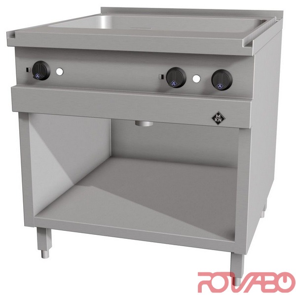 Multifunctional unit for frying, cooking and stewing. Appliance with two separate heating zones with thermostatic temperature regulation. Griddle pan with frying pan made completely of chrome nickel steel 1.4404 (AISI 316), frying surface 705x545, 100 mm deep made from a smoothly polished special sandwich material (MKN PowerBlock). Supra contact heating elements for optimal heat distribution and short heating up times. Greater heating capacity ensures even heat distribution and minimal temperature fluctuation when loading with cold food. Frying surface is tightly welded ensuring maximum hygiene. Main switch, thermostat, control lamp, safety temperature thermostat, SUPRA contact heating elements, mains connection, IPX 5. Equipped as standard with interface for connection to an energy optimization system according to DIN 18875 and potential free contact. Accessories: 1 Plug. Optional accessories: 1 Emptying system including 1/1 GN container and splash guard, without door; appliance foot, 200 mm high, pluggable +/– 15 mm height adjustable (4 feet).