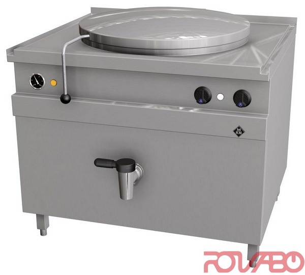 Inner kettle Ø665 mm, 500 mm deep made completely of extremely corrosion-resistant chrome nickel steel (1.4404) (AISI 316). Heat up time 32 min (according to DIN 18855). Double jacketed kettle with separate, integrated and maintenance-free VAPRO steam generator for short heating up times and low energy and water consumption as well as highly efficient. Short heating up times with VAPRO pressure steam system. 3 cooking programmes as standard (light simmering, medium boiling and strong boiling). Thermostatic or electronic temperature regulation. Automatic process water monitoring and feed – is constantly ready for use. Double-walled hinged lid and mixer tap as standard. Emptying via safety drain cook at the front. Equipped as standard with interface for connection to an energy optimization system according to DIN 18875 and potential free contact. Main switch, power switch, thermostat, temperature monitor, control lamps, tubular heating elements, pilot heating elements, contactor, water solenoid valve, water level regulator with electrode, pressure regulator, mains connection, IpX6. Fittings: air valve, safety valve. Heat emission sensitive: 0.91 kW, latent: 5.2 kW. Accessories: extra large drain cock 1½" made of chrome nickel steel, 1 drain filter, 1 Mixer tap with outlet R¾" (DN 20). Optional accessories: 2 Chrome nickel steel cooking inserts, perforation Ø10 mm, 1 pair of lifting hooks, 1 Measuring rod, appliance foot, 200 mm high, pluggable +/– 15 mm height adjustable (4 feet).
