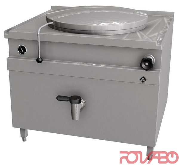 Inner kettle Ø665 mm, 500 mm deep made completely of extremely corrosion-resistant chrome nickel steel (1.4404) (AISI 316). Heat up time 24 min. Regulation via manual steam valve (Type of protection: IPX6). Double-walled hinged lid and mixer tap as standard. Emptying via safety drain cook at the front. Fittings: Steam valve DN 25, air valve, safety valve. For steam generator installation on site. Nominal thermal load: 41 kW (66 kg/h), steam pressure connection 0.5-0.8 bar. Heat emission sensitive: 1.4 kW, latent: 8.2 kW. Accessories: extra large drain cock 1½" made of chrome nickel steel, 1 drain filter, 1 Mixer tap with outlet R¾" (DN 20). Optional accessories: 2 Chrome nickel steel cooking inserts, perforation Ø10 mm, 1 pair of lifting hooks, 1 Measuring rod, appliance foot, 200 mm high, pluggable +/– 15 mm height adjustable (4 feet).