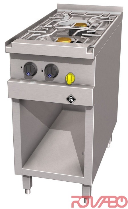 Moulded steel hobs tightly fitted to the substructure. Hob depth of 70 mm prevents the burning on of boiled over food. Gas tap in the front panel as standard. C-burner 3.5 kW (at the front), Е-burner 7.0 kW (at the rear). DN 20 (¾") gas connection required. Atmospheric burner, ignition burner, thermoelectric safeguard, tap switch, gas stop tap. Natural 20; 25 mbar or liquid gas 30; 37; 50 mbar. 1 CNS sliding grid (370x700 mm).