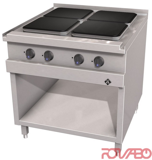 Hot plates with protector 300х300 mm, 2x2.5 kW (rear left, front right) and 2x4.0 kW (rear right, front left). Protectors automatically cut down power level by approx. 50% when not in use. 7 position switch for accurate temperature regulation. Mains connection. IPX 5. Space between hot plates less than 35 mm making moving of heavy cookware much easier. Oven, interior chamber and oven door made of chrome nickel steel. Optionally equipped for connection to a power optimization system with potential free contact.