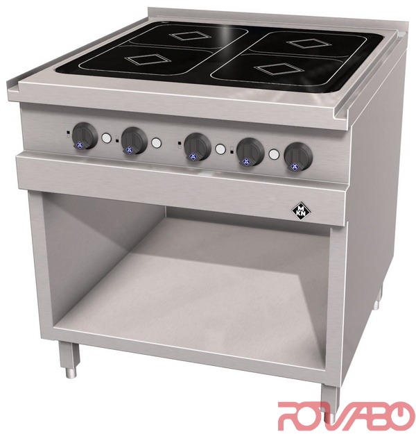 Seamless and solid ceramic hob 700x690 mm, easy to clean, 6 mm thick. Separately regulated heating zones, each with 5.0 kW. Electronic pan size recognition, from 12 cm pan bottom diameter. Fast heat transfer, high efficiency. Infinitely variable heating power for each heating zone using a position switch – one control lamp for each heating zone individually aligned for keeping food warm, simmering, frying and heating up fast. Main switch, surface induction generator module 280x290 mm with control element, contactor, fan, mains connection, IPX 5. Optionally equipped for connection to a power optimization system with potential free contact.