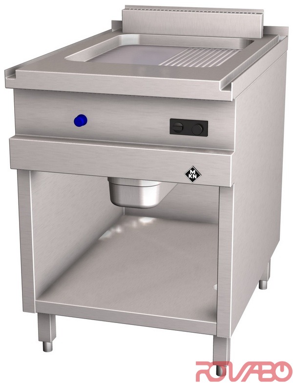 Plate lowered and seamlessly welded into the top plate, with easy to clean corner radii. Thermostatic temperature regulation. Frying plate made of heat resistant special steel. Fat collecting container approx. 4 litres. Natural 20; 25 mbar or liquid gas 30; 37; 50 mbar. Frying surface 420x545 mm. DN 15 (½") gas connection required. Atmospheric burner, ignition burner, thermoelectric safeguard, thermostat, piezoelectric ignition. Optional accessories: splash guard, griddle plate scraper for smooth and ribbed griddle plates, appliance foot, 200 mm high, pluggable +/– 15 mm height adjustable (4 feet).