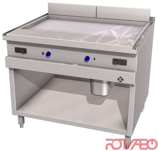 Plate lowered and seamlessly welded into the top plate, with easy to clean corner radii. Thermostatic temperature regulation. Frying plate made of heat resistant special steel. Fat collecting container approx. 6.25 litres. Natural 20; 25 mbar or liquid gas 30; 37; 50 mbar. Frying surface 900x545 mm, 2 zones. DN 15 (½") gas connection required. Atmospheric burner, ignition burner, thermoelectric safeguard per zone, piezoelectric ignition. Optional accessories: splash guard, griddle plate scraper for smooth and ribbed griddle plates, appliance foot, 150 mm high, pluggable +/– 15 mm height adjustable (4 feet).