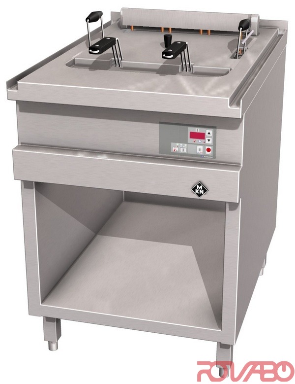Pressed steel frying basin 400x400x235 mm deep, max. 30 ltr., is seamlessly welded into the top plate with large froth over tray. With EcoControl electronic temperature regulation and membrane keypad. Chrome nickel steel tubular heating elements with a low surface load for longer lasting fat, basin with deeper, cool zone. With increased heating capacity. Heating elements can be raised completely out of the frying basin, with holding bracket and automatic cut off, incl. for easy cleaning. Thermostatic or electronic temperature regulation. Safety temperature thermostat for reliable overheating protection. Safe oil drainage from the bottom via slide valve. Main switch, thermostat, safety temperature thermostat, control lamp, tubular heating elements, contactor, end switch, mains connection, IPX5. Equipped as standard with interface for connection to an energy optimization system according to DIN 18875 and potential free contact. Oil melting cycle is available on request. Accessories: 1 lid, 1 oil clarifying tray, 1 basket "p", 2 baskets "L". Optional accessories: 1 filter basket including 40 filter bags made of special fleece paper, 1 oil receptacle 30 litres, 1 splash guard, oil filtering system.