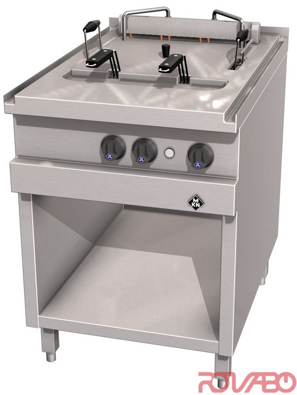 Pressed steel frying basin 400x400x235 mm deep, max. 30 ltr., is seamlessly welded into the top plate with large froth over tray. Chrome nickel steel tubular heating elements with a low surface load for longer lasting fat, basin with deeper, cool zone. With frying basket lifting mechanism with timer. Heating elements can be raised completely out of the frying basin, with holding bracket and automatic cut off, incl. for easy cleaning. Thermostatic or electronic temperature regulation. Safety temperature thermostat for reliable overheating protection. Safe oil drainage from the bottom via slide valve. Main switch, thermostat, safety temperature thermostat, control lamp, tubular heating elements, contactor, end switch, mains connection, IPX5. Equipped as standard with interface for connection to an energy optimization system according to DIN 18875 and potential free contact. Oil melting cycle is available on request. Accessories: 1 lid, 1 oil clarifying tray, 1 basket "p", 2 baskets "L". Optional accessories: 1 filter basket including 40 filter bags made of special fleece paper, 1 oil receptacle 30 litres, 1 splash guard, oil filtering system.