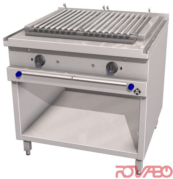 Especially for grilling steaks etc. Special cooking method over lava stones. Grill surface, 2 zones, 320x510 mm each. With two separately controllable heating zones. DN 15 (½") gas connection required. Atmospheric burner, ignition burner, thermoelectric safeguard, piezoelectric ignition, gas tap for each one. Natural 20; 25 mbar or liquid gas 30; 37; 50 mbar. Accessories: 2 Cast iron grates, lava stones. Optional accessories: 1 Grill grid (2 are required), appliance foot, 200 mm high, pluggable +/– 15 mm height adjustable (4 feet).