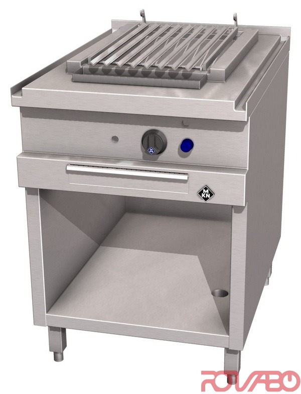 Especially for grilling steaks etc. Special cooking method over lava stones. Grill surface: 320x510 mm. DN 15 (½") gas connection required. Atmospheric burner, ignition burner, thermoelectric safeguard, piezoelectric ignition, gas tap. Natural 20; 25 mbar or liquid gas 30; 37; 50 mbar. Accessories: 1 Cast iron grate, lava stones. Optional accessories: 1 Grill grid, appliance foot, 200 mm high, pluggable +/– 15 mm height adjustable (4 feet).