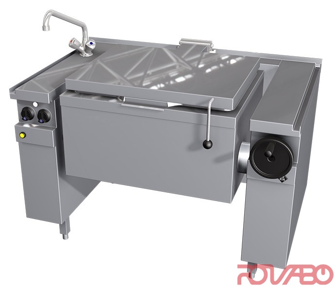 Ideal pan positioning prevents spills and guarantees that the pan is fully emptied. Pan measurements: 700x540 mm, 210 mm deep. 55 mm gap between pan and side columns – for easy cleaning. Double walled hinged lid and mixer tap as standard. Pan bottom made of special sandwich material as standard. Even heat distribution over the complete bottom of the pan. Thermostatic temperature regulation. Main switch, end switch, interference button, thermostat, gas solenoid valve, control lamp, mains connection, IpX5. Atmospheric burner, electronic ignition and flame monitor, ignition link. DN 20 (¾") gas connection required. Natural 20; 25 mbar or liquid gas 30; 37; 50 mbar. Heat emission sensitive: 5.4 kW, latent: 5.4 kW. Accessories: 1 Mixer tap with outlet R¾" (DN 20). Optional accessories: 1 pan scraper, 1 Scoop, unperforated, 1 Scoop, perforated, appliance foot, 200 mm high, pluggable +/– 15 mm height adjustable (4 feet).